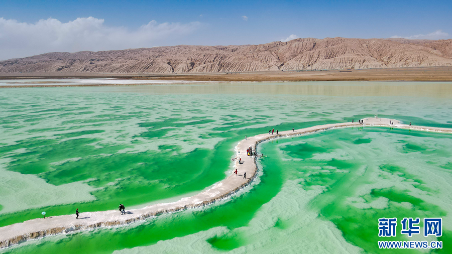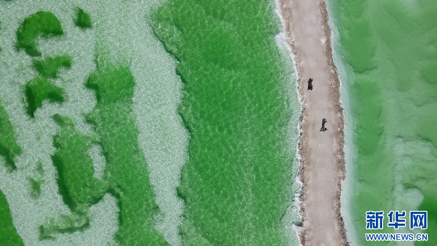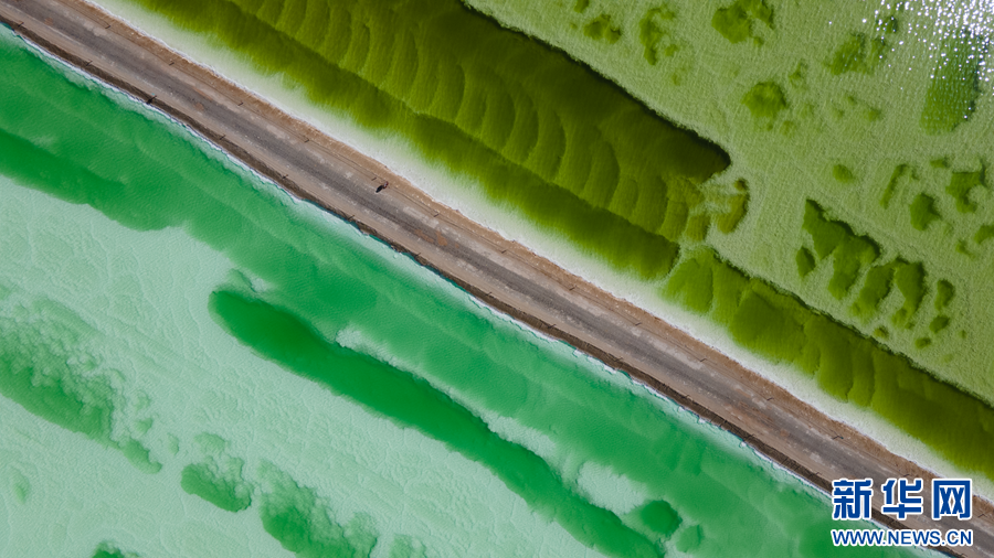 茫崖翡翠湖位于青海省海西蒙古族藏族自治州茫崖市花土溝鎮,屬于硫酸鎂亞型鹽湖,由于所含礦物質濃度的不同,在陽光的映照下,湖水呈現出深淺不一的翠綠色,就像無數塊翡翠鑲嵌在大地上。從無人機視角望去,茫崖翡翠湖宛如色彩絢麗的油畫,清新的色澤,甜蜜又夢幻。