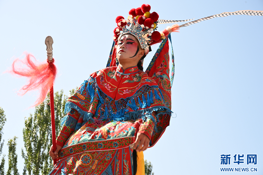 7月7日,環青賽第二賽段起點處的高蹺表演。