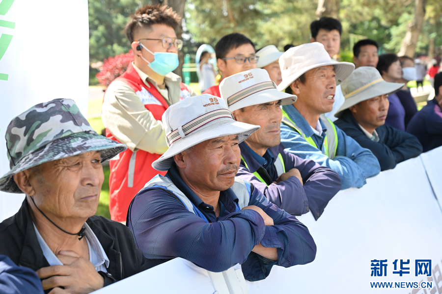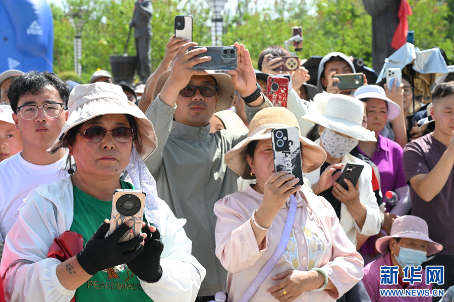 海東市互助土族自治縣群眾在頒獎區記錄運動員頒獎瞬間。