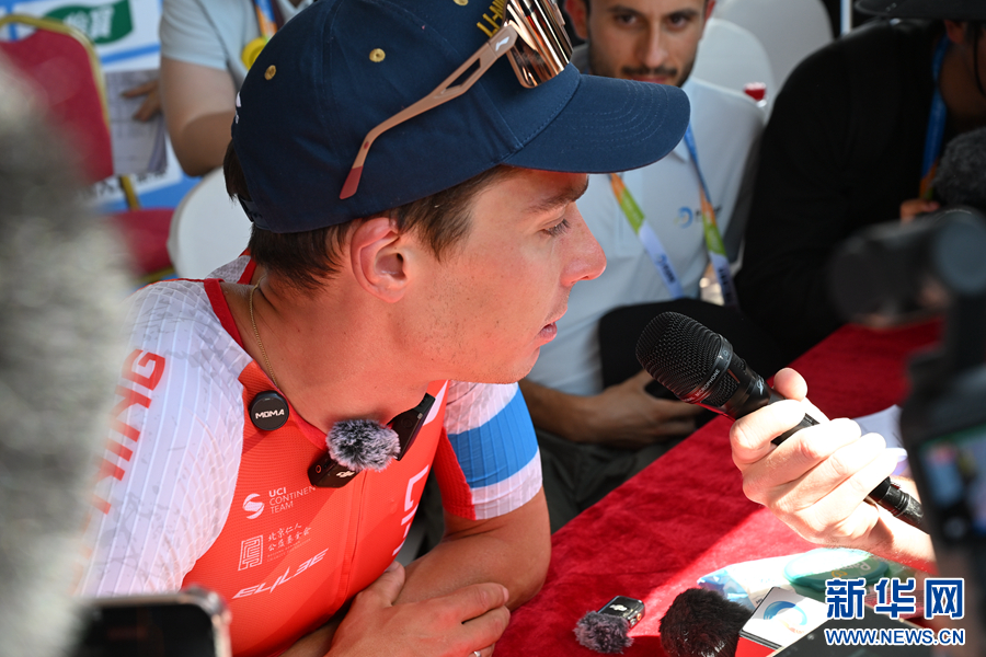 李寧之星車隊運動員佩洛德·西蒙在頒獎結束后接受采訪。