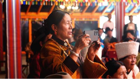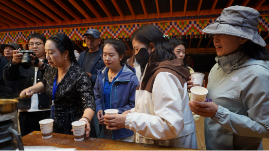 9號大帳內抑揚頓挫的曲調吸引眾多游客前往大帳觀看欣賞,大家拿出手機紛紛拍照留念,帳內工作人員熱情地為大家倒上熱騰騰的酥油奶茶,為遠道而來的客人洗塵解乏。