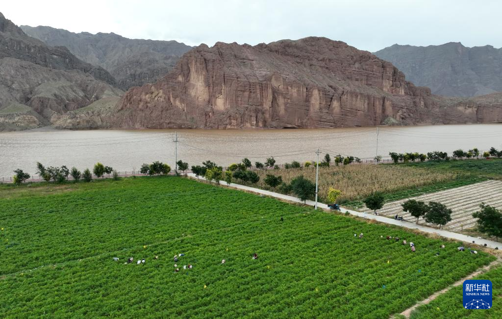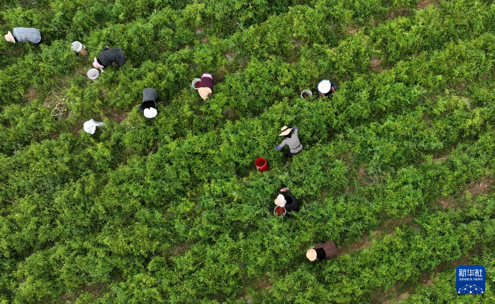 9月11日,在青海省海東市循化撒拉族自治縣清水鄉下灘村,當地群眾在采摘線辣椒(無人機照片)。新華社記者 周盛盛 攝