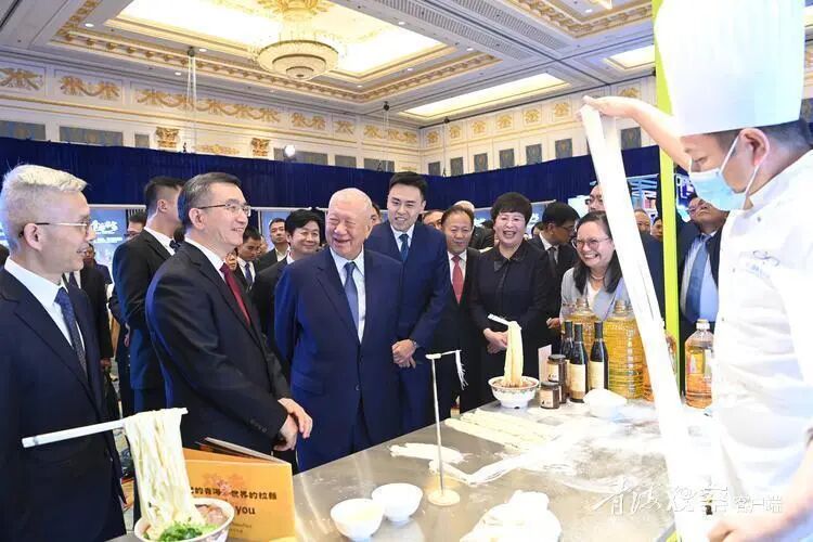 10月28日,2025青?!拈T經貿交流合作推介會在澳門舉行。圖為,全國政協副主席何厚鏵,省委副書記、省長羅東川等嘉賓在活動現場參觀青海拉面的展示。青海日報融媒體記者 祁國彪 攝